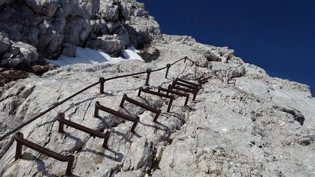 Keywords: climbing alpspitze head ladder rungs kicks gradually away height rise climb north face ferrata rock alpine weather stone mountain zugspitze massif ostallgäu allgäu landscape