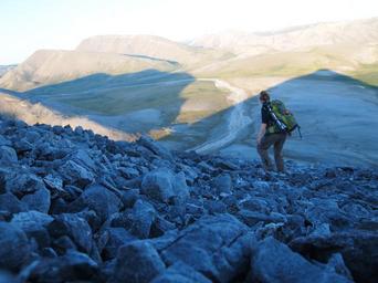 Keywords: Tonight I tried to climb the northwest mountain again. The ascent past yesterday’s endpoint was steep and a little frightening. All the rocks were sharp like knives sticking out of the earth, and there weren’t many stable places to step. Occasionally I would take a step up and then slide back down two or three feet. Eventually the steep grade required me to climb like a Dall’s sheep, making zig-zag switchbacks all the way to the top. Near the peak, two birds flew right past me, zoomed to the top of the mountain. Lucky birds, I wish I could fly up to the top! (Nakolik - Waypoint 6) noatak national preserve virtual visit