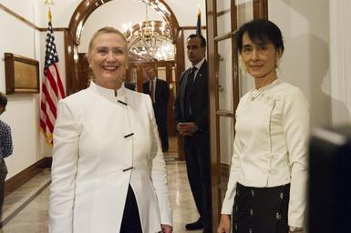 | Keywords: Clinton and Aung San Suu Kyi after having dinner.jpg en United States Secretary of State Hillary Clinton meets with Burma's pro-democracy leader Aung San Suu Kyi 2011-12-01 State gov http //www state gov/r/pa/ei/pix/2011/12/177900 htm U S State Department link United States government employees Aung San Suu Kyi Clinton visit 2011 jpg PD-USGov Uploaded with UploadWizard Visit by Hillary Rodham Clinton to Myanmar in 2011 Aung San Suu Kyi Photographs of flags of the United States | ||||