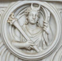 | Keywords: Clipeus Selene Terme.jpg Bust of Selene in a clipeus detail from a strigillated lenos sarcophagus Roman artwork Buste de Séléné dans un clipeus détail d'un sarcophage à lenos Œuvre romaine Busto di Selene dentro clipeo dettaglio di uno sarcofago strigilato a lenos Opera romana early other date century 3 AD marble white Museum Terme di Diocleziano Cloister object history From Tomb D in Via Belluzzo Rome Provenance tombe D Via Belluzzo Rome Rinvenuto a Roma via Belluzzo tomba D credit line accession number Marie-Lan Nguyen 2006 other versions Selene in ancient Roman art Ancient Roman reliefs in Rome Museo delle Terme Ancient Roman reliefs in the Museo delle Terme di Diocleziano Rome Ancient Roman sarcophagi in Rome Terme 3rd-century sarcophagi Rome Round reliefs in Rome Terme Torches in art Luna mythology Women with a crescent on their head |