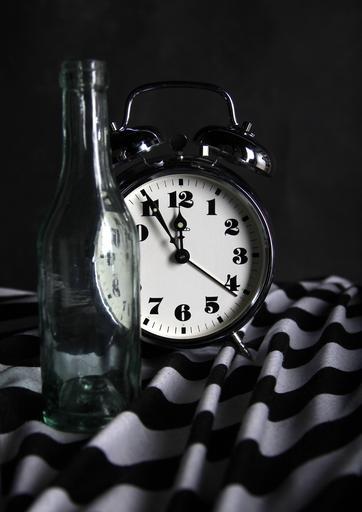 Keywords: clock shirts composition time alarm clock white black a bottle of still life studio