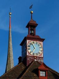 Keywords: clock time indicating time of town hall clock spire stein am rhein roof golden