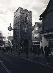 Keywords: clock tower town village architecture buildings stores shops people pedestrians walking streets sidewalk cobblestone road black and white