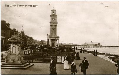 | Keywords: ClockTower Herne Bay 010.jpg Postcard of the Clock Tower and Portland stone drinking fountain given to the town in 1888 by London Alderman Col Horatio Davies who became Lord Mayor of London The drinking fountain is now in a sunken garden opposite Telford Terrace on the sea front The third Herne Bay Pier is in the background ;Points of interest The photo can be dated at 1910 because the Grand Pier Pavilion built in 1910 is still under construction at the back The old fog-warning guns from the first pier are not yet on the steps of the Clock Tower A poster near the Clock Tower advertises the Jollity Boys who used to perform on the roof at King's Hall - you have to zoom in to see this The engraved dedication to Ann Thwaytes who paid for the Clock Tower is visible on the canopy over the door Scan of original postcard 1910 postcard is postmarked 1911 anonymous out of copyright PD-old-70-1923 Herne Bay clock tower Herne Bay Pier |