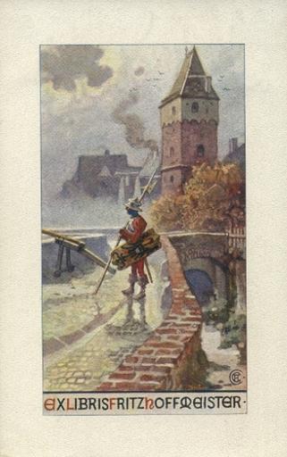 Keywords: Closs Ex libris Fritz Hoffmeister.jpg Ex libris Fritz Hoffmeister Motiv Wächter auf Stadtmauer http //www antiquariat de unknown Gustav Adolf Closs PD-old Ex-libris of Germany Gustav Adolf Closs City walls in art