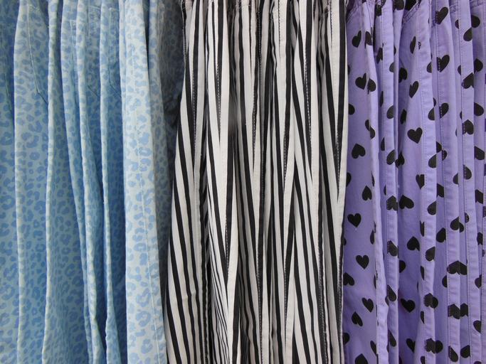 Keywords: clothing fabric long pants detail view close-up colored patterned striped heart pattern lip pattern textiles cloth white blue spring fashion black light purple light blue shopping trade