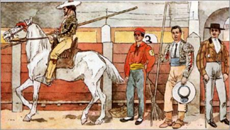 | Keywords: Clothing of Spain Table155-2.jpg Clothing of Spain Corrida - picadores 1 Пикадо Отк ывает бой нападая на быка с копьем и должен п оде жаться до его пе вого уда а же твой кото ого обычно становится ста ая лошадь уже не п едставляющая ценности У копья ко откое т ехг анное ост ие на кото ое насаживается де евянный валик чтобы не анить быка се ьезно а только азд азнить его Большая плоская се ая фет овая шляпа с озеткой из лент Под кожаными штанами - железные поножи Изящная ку тка не ук ашенная таким множеством кистей 2 Слуга пикадо а Он помогает подняться упавшему пикадо у в то в емя как эспада отвлекает быка на себя 3 Пикадо в удлиненных кожаных ве хних штанах 4 Участник боя быков в повседневной одежде History of costume http //silveromsk virtbox ru/moda/index152-2 html century 19 anonimous PD-Art Clothing of Spain Files uploaded by Shakko from various sources Bullfighting costumes Sombreros |