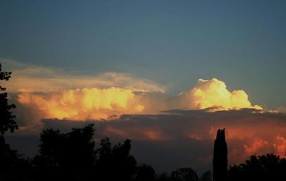 Keywords: cloud bank layers cumulus glowing luminous orange yellow white bright pinks tree line sky blue