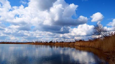 Keywords: clouds cumulus clouds reed lake mirroring water sky landscape