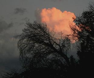 Keywords: clouds dense round sunset orange-pink bright glow light luminous trees boughs branches bending arching silhouettes grey sky