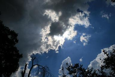 Keywords: clouds gathering closing in storm building dark light edges luminous blue sky trees