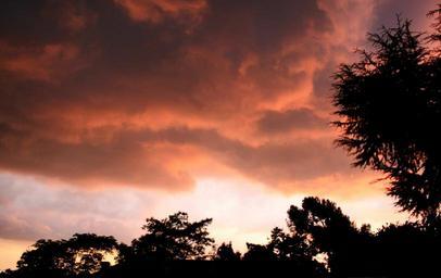 Keywords: clouds low stormy glowing light pechy-pink blushing trees sky