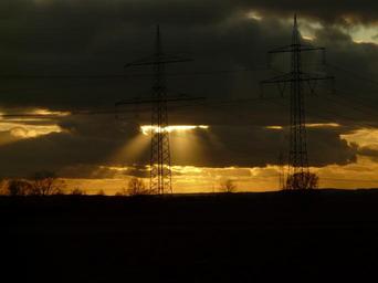 Keywords: clouds sky sun sunbeam opening god faith light dark hell power poles energy electricity