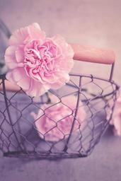 Keywords: cloves flowers pink carnation pink petals cut flowers basket metal basket close