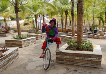 Keywords: clown man cycle funny character person male costume film city bangalore india