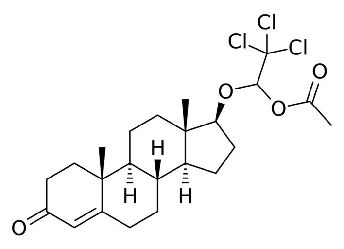 Keywords: Cloxotestosterone acetate.svg Chemical structure of cloxotestosterone acetate Own 13 06 27 November 2016 UTC Ed Edgar181 Testosterone Prodrugs Trichloromethyl compounds Acetate esters