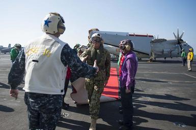 | Keywords: CNO visits sailors 131128-N-WL435-005.jpg en Chief of Naval Operations Adm Jonathan Greenert is greeted by Rear Adm Kevin Sweeney commander of Carrier Strike Group Ten as he and Master Chief Petty Officer of the Navy Mike Stevens arrive to visit with sailors aboard the aircraft carrier USS Harry S Truman CVN 75 for dinner and an all-hands call on Thanksgiving Day Greenert and Stevens spent time with members of their Navy-Marine Corps family during the Thanksgiving holiday period to show their support and appreciation for the many men and women who serve in the military U S Navy photo by Chief Mass Communication Specialist Peter D Lawlor/Released 2013-11-28 Petty Officer 1st Class Peter Lawlor https //www dvidshub net/image/1064368 131128-N-WL435-005 2013-12-02 23 17 GULF OF OMAN AT SEA PD-USGov-Military-Navy Jonathan W Greenert in 2013 USS Harry S Truman CVN-75 Images from DoD uploaded by Fæ |