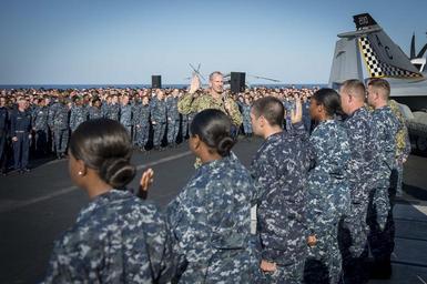| Keywords: CNO visits sailors 131128-N-WL435-766.jpg en Chief of Naval Operations Adm Jonathan Greenert and Master Chief Petty Officer of the Navy Mike Stevens re-enlist sailors aboard the aircraft carrier USS Harry S Truman CVN 75 during an all-hands call on Thanksgiving Day Greenert and Stevens also shared dinner with the crew to spend time with members of their Navy-Marine Corps family during the Thanksgiving holiday period and show their support and appreciation for the many men and women who serve in the military U S Navy photo by Chief Mass Communication Specialist Peter D Lawlor/Released 2013-11-28 Petty Officer 1st Class Peter Lawlor https //www dvidshub net/image/1064381 131128-N-WL435-766 2013-12-02 23 17 GULF OF OMAN AT SEA PD-USGov-Military-Navy Jonathan W Greenert in 2013 USS Harry S Truman CVN-75 Images from DoD uploaded by Fæ |