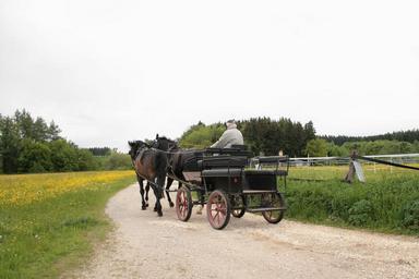 Keywords: coach horse drawn carriage team horses spokes old means of transport ross flower meadow away forest nature grass landscape farm farmer