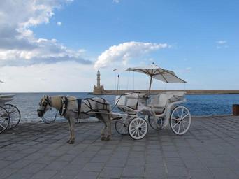 Keywords: coach horse horse drawn carriage wagon lighthouse sea blue water sky clouds