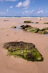 Keywords: coast beach stones sea seaweed surfer surfboard water sky landscape nature clouds lake wave idyll mirroring atlantic sand beach leisure holiday holidays recovery