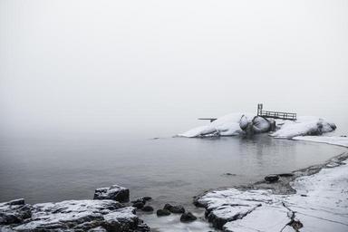 Keywords: coast boulders footbridge shore snow winter rocks craggy lake sea ocean water landscape scenic fog mist season cold bay cove nature