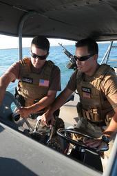 | Keywords: Coast Guard MSST Patrol DVIDS280392.jpg en U S Coast Guard Petty Officer 2nd Class Jonathan O'Connor a waterside securityman with Maritime Safety and Security Team 91103 instructs a new crewmember U S Coast Guard Petty Officer 2nd Class Joshua Graham a waterside securityman with MSST 91104 on boat operations May 12 2010 A detachment of MSST 91104 from Galveston Texas recently replaced a detachment from MSST 91103 homeported in Los Angeles/Long Beach Calif The Coast Guard detachments perform maritime anti-terrorism and force protection duties for Joint Task Force Guantanamo 2010-05-12 Petty Officer 3rd Class Joshua Nistas https //www dvidshub net/image/280392 100512-N-+++++-327 2010-05-18 16 51 GUANTANAMO BAY CU PD-USGov-Military-Navy Joint Task Force Guantanamo Guantanamo Bay Images from DoD uploaded by Fæ |