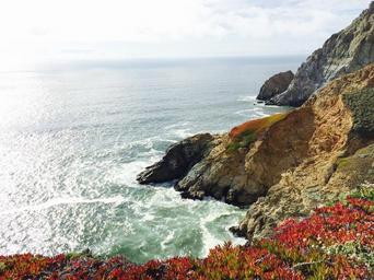 Keywords: coast shore wild rocky cliff ocean sea waves water vegetation wildflowers nature coastline craggy travel scenic view steep
