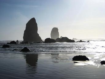 Keywords: coastline beach sand waves rocks pillars nature seascape coast sky sea ocean outdoors seashore water shadows reflections