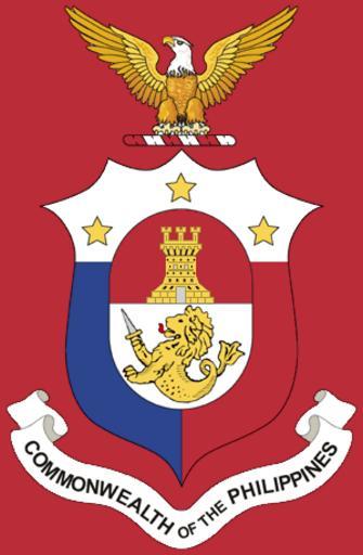 | Keywords: Coat of arms of the Commonwealth of the Philippines.png File Coat of arms Commonwealth of the Philippines svg en Coat of arms of the Commonwealth of the Philippines 1935 “1946 Arms ” Paleways of two pieces azure and gules; a chief argent studded with three golden stars equidistant from each other; over all the arms of Manila per fess gules and argent in chief the castle of Spain or doors and windows argent in base a sea lion or langued and armed gules in dexter paw a sword hilted or <br> Crest ” The American eagle displayed proper Beneath a scroll with the words 'Commonwealth of the Philippines' inscribed thereon 1940 Malacañan Presidential Museum reinstated under COMMONWEALTH ACT NO 614 Government of the Commonwealth of the Philippines other versions PD-Philippines PD-USGov Historical coats of arms of the Philippines ImageNote 1 50 216 200 185 300 458 2 Paleways of two pieces azure and gules ImageNoteEnd 1 ImageNote 2 28 121 245 94 300 458 2 a chief argent studded with three golden stars equidistant from each other ImageNoteEnd 2 ImageNote 3 85 172 129 170 300 458 2 over all the arms of Manila per fess gules and argent ImageNoteEnd 3 ImageNote 4 118 182 65 74 300 458 2 in chief the castle of Spain or doors and windows argent ImageNoteEnd 4 ImageNote 5 91 252 120 84 300 458 2 in base a sea lion or langued and armed gules in dexter paw a sword hilted ImageNoteEnd 5 ImageNote 6 42 2 219 118 300 458 2 The American eagle displayed proper ImageNoteEnd 6 ImageNote 7 1 316 298 141 300 458 2 Beneath a scroll with the words 'Commonwealth of the Philippines' inscribed thereon ImageNoteEnd 7 |