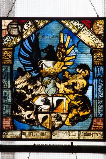 Keywords: coat of arms european tradition hereditary characters person family group of people boar wing feather helm knight helmet heraldry stained glass lead leaded glass gothic old antique ulm storage in the münster 1555
