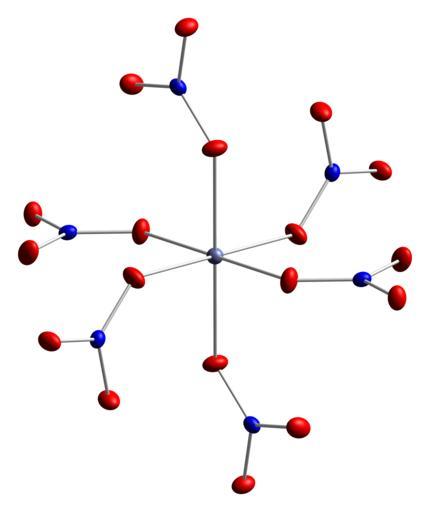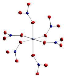 | Keywords: Cobalt(II)-nitrate-xtal-2002-Co2-coordination-CM-3D-ellipsoids.png Thermal ellipsoid diagram of the coordination environment of cobalt 2 Co2 in the crystal structure of cobalt II nitrate Co NO<sub>3</sub> <sub>2</sub> Colour code Cobalt Co grey-blue Nitrogen N blue Oxygen O red Crystal structure from Z anorg allg Chem 2002 628 269-273 doi <small>10 1002/1521-3749 200201 628 1<269 AID-ZAAC269>3 0 CO;2-P</small> Image generated in http //www crystalmaker com/ CrystalMaker 8 3 Own 2010-09-19 Ben Mills Benjah-bmm27 Images by Ben Mills Cobalt II nitrate |
