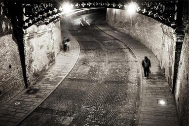 Keywords: cobblestone street road sidewalk stones people pedestrians walking night dark evening bridge architecture town city