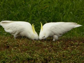 Keywords: cockatoo parrot bird sulphur crested australia wild pair two forage