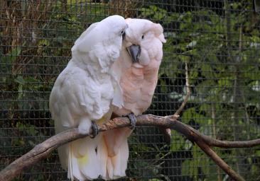 Keywords: cockatoo white pink cage together affection parrot birds bird caught exotic sit