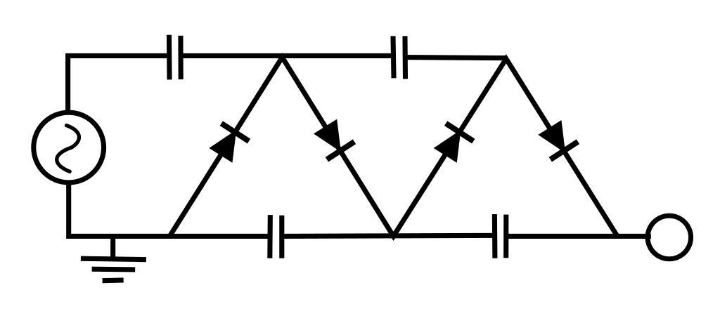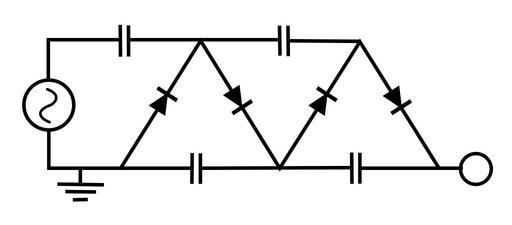 | Keywords: Cockcroft Walton Voltage multiplier.svg ru схема умножителя нап яжения Cockcroft-Walton voltage multiplier circuit also called the Greinacher multiplier Powered by an alternating current it produces a DC voltage at the righthand terminal equal to NV<sub>pp</sub> where V<sub>pp</sub> is the peak-to-peak voltage swing of the source and N is the number of stages This diagram shows a 2 stage circuit The voltage multiplier is used widely in CRT television sets photomultiplier tube power supplies copiers laser printers and the Cockcroft-Walton particle accelerator 2013-03-15 11 28 02 own Talifero cc-zero Uploaded with UploadWizard Cockcroft-Walton generators |