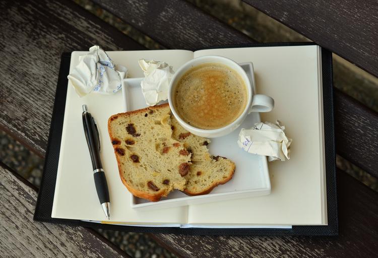 Keywords: coffee break coffee break cup notebook write down plan paper ball new start drink relax breakfast cake pastries aroma rest caffeine table