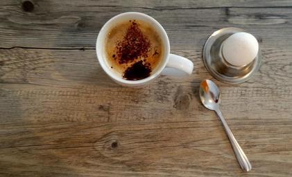 Keywords: coffee cake coffee mugs eat breakfast egg breakfast egg egg cups delicious food boiled egg tasty soft background wood milk spoon