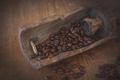 Keywords: coffee coffee beans roasted brown dark natural product caffeine wooden shovel wood close