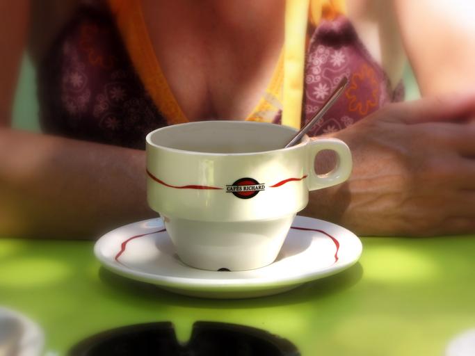 Keywords: coffee coffee break cup and saucer coffee time coffee table cafe cappuccino cup décolleté break time table lady terrace summer sunny company cosy