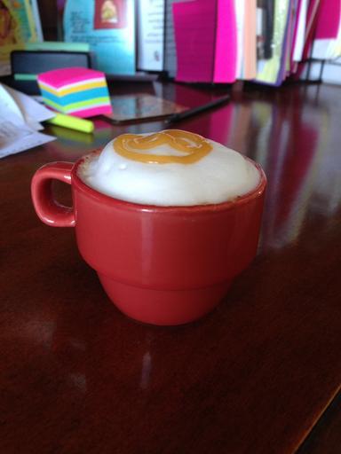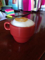 Keywords: coffee espresso froth breakfast red cup cappuccino morning working