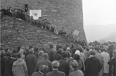 <i>Geoff Charles' photographs also form part of the <a href="http://www.llgc.org.uk/index.php?id=5728" rel="nofollow">Europeana Libraries Project</a></i></i> cymru wales llyfrgellgenedlaetholcymru nationallibraryofwales charlesgeoff19092002 negyddffilm filmnegatives investitute protest caernarfon castle carnarvon welsh Cofia 1282, a protest against the investiture (1537984)3.jpg Photographs by Welsh photo journalist Geoff Charles 'Cofia 1282' a protest against the investiture of Prince Charles at Caernarfon Castle in North Wales 1537984 1969-03-06 Creator Geoff Charles CC-zero Photographs by Geoff Charles in the National Library of Wales Images uploaded as part of NLW - WMUK collaboration Demonstrations and protests in Wales Caernarfon |