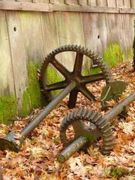 Keywords: cogs cogwheels leaves foliage weathered grist mill machine machinery iron metal