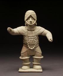 | Keywords: Colima - Dancing Figure Whistle - Walters 20092029.jpg Dance among the most ephemeral of the arts was central to Mesoamerican civilization Dance performances as attested by their depiction on vases and other utilitarian objects such as this whistle typically encompassed rhythmic structured movement often by a group of people Music was a vital element frequently supplied by the dancers themselves Performances served to bring together the community by reifying shared beliefs of social behavior recounting seminal histories-both historical and mythic-and incarnating religious ideologies As communal theater performers were bedecked in ostentatious costumes that served to remove them from their social identities and the everyday reality of the community The elaborate costuming and staging also elevated the event from a simple entertainment to an impressive even iconic spectacle This festooned dancer bends his knees and stretches out his arms as if frozen in mid-motion Small holes in his hands likely accommodated dance fans or other performance accouterments Necklaces composed of round beads perhaps of precious jadeite and a variety of bands adorn his wrists and legs A wide neckpiece draped over the figure's shoulders and chest may have been made from pieces of cut shell His sleeveless shirt might represent a tufted textile or animal hide although it also recalls portrayals of the flayed skin of a sacrificial victim worn by celebrants as part of the rites of the deity Xipe Totec The dancer's loincloth and overskirt are tied at the back with a large bow that resembles a bustle A decorated textile band is wrapped adroitly around his head and secured by a strap below his chin This object is a whistle likely played by a performer similar to the dancer depicted by the instrument; its mouthpiece is found at the back of the figure's head 300 BC-AD 200 earthenware cm 23 34 16 76 10 16 accession number 2009 20 29 80184 David Stuart Galleries date and mode of acquisition unknown John G Bourne 1980s by purchase Walters Art Museum Gift of John Bourne 2009 place of origin Colima Mexico Walters Art Museum license Colima - Dancing Figure Whistle - Walters 20092029 Objects from Colima in the Walters Art Museum Media contributed by the Walters Art Museum needs category review Loincloths in art |