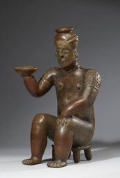 | Keywords: Colima - Seated Female Figure - Walters 20092053 - Three Quarter Left.jpg The Coahuayana River Valley was home to many large villages and towns and their artists produced a distinctive local version of the large hollow tomb figure Coahuayana figural art is characterized by elegant renderings of persons of authority Most portrayals lack individuality and instead serve as sculptural representations of social position or political rank This seated female's serene countenance shoulder scarification patterns necklace and pierced ears denote a person of high status The artist accentuated the figure with red slip enhancing her hair forearms and legs below the knee Her identification as a person of authority is further indicated by her sitting on a four-legged stool or bench; this type of seating was closely associated with elevated status throughout the ancient Americas She raises a small dish in her right hand as if proffering its contents to unseen persons perhaps participants in an aristocratic feasting event 100 BC-AD 300 earthenware burnished red slip paint with resist designs in black cm 49 5 30 5 24 8 accession number 2009 20 53 80208 Stendhal Galleries Los Angeles date and mode of acquisition unknown John G Bourne 1940s by purchase Walters Art Museum Gift of John Bourne 2009 place of origin Michoacán Mexico Walters Art Museum license Objects from Colima in the Walters Art Museum Media contributed by the Walters Art Museum needs category review |