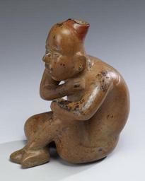 | Keywords: Colima - Seated Figure - Walters 20092016 - Three Quarter Left.jpg The valleys of the Río Armería and Río Coahuayana which drain the mountains of the modern Mexican state of Colima nurtured the development of a robust culture Although the peoples' names and languages are lost to time their vitality is preserved in remarkable ceramic sculptures and a pottery vessel tradition that are unique in Mesoamerica Yet these artworks also incorporate a variety of features found among many Mexican societies thereby indicating ancient Colima's membership in the greater Mesoamerican community Colima's hollow figural art characterized by its monochrome orange-red or deep red slip palette is one of the most unified artistic statements of Mesoamerica The surfaces were highly burnished to achieve a bright shine interrupted only by black manganese staining resulting from a natural corrosive process Here the sculptor draws attention away from the engaging figure by highlighting the vessel's orifice with deep red slip paint The sculptor's mastery of the human form is seen in the adept rendering of the twist of the back as the figure leans forward on his bent knee The acuteness of the twist however may also depict a skeletal defect The figure's gesture-right hand held to the chest-is a pan-Mesoamerican sign of deference 100 BC-AD 300 Comala Phase earthenware burnished slip in red and light brown cm 25 2 18 21 5 accession number 2009 20 16 80171 Stendahl Galleries Los Angeles date and mode of acquisition unknown John G Bourne 1980s by purchase Walters Art Museum Gift of John Bourne 2009 place of origin Colima Mexico Walters Art Museum license Objects from Colima in the Walters Art Museum Media contributed by the Walters Art Museum needs category review |