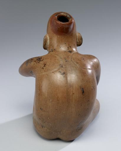 | Keywords: Colima - Seated Figure - Walters 20092016 - Back.jpg The valleys of the Río Armería and Río Coahuayana which drain the mountains of the modern Mexican state of Colima nurtured the development of a robust culture Although the peoples' names and languages are lost to time their vitality is preserved in remarkable ceramic sculptures and a pottery vessel tradition that are unique in Mesoamerica Yet these artworks also incorporate a variety of features found among many Mexican societies thereby indicating ancient Colima's membership in the greater Mesoamerican community Colima's hollow figural art characterized by its monochrome orange-red or deep red slip palette is one of the most unified artistic statements of Mesoamerica The surfaces were highly burnished to achieve a bright shine interrupted only by black manganese staining resulting from a natural corrosive process Here the sculptor draws attention away from the engaging figure by highlighting the vessel's orifice with deep red slip paint The sculptor's mastery of the human form is seen in the adept rendering of the twist of the back as the figure leans forward on his bent knee The acuteness of the twist however may also depict a skeletal defect The figure's gesture-right hand held to the chest-is a pan-Mesoamerican sign of deference 100 BC-AD 300 Comala Phase earthenware burnished slip in red and light brown cm 25 2 18 21 5 accession number 2009 20 16 80171 Stendahl Galleries Los Angeles date and mode of acquisition unknown John G Bourne 1980s by purchase Walters Art Museum Gift of John Bourne 2009 place of origin Colima Mexico Walters Art Museum license Objects from Colima in the Walters Art Museum Media contributed by the Walters Art Museum needs category review |