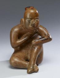 | Keywords: Colima - Seated Figure - Walters 20092016.jpg The valleys of the Río Armería and Río Coahuayana which drain the mountains of the modern Mexican state of Colima nurtured the development of a robust culture Although the peoples' names and languages are lost to time their vitality is preserved in remarkable ceramic sculptures and a pottery vessel tradition that are unique in Mesoamerica Yet these artworks also incorporate a variety of features found among many Mexican societies thereby indicating ancient Colima's membership in the greater Mesoamerican community Colima's hollow figural art characterized by its monochrome orange-red or deep red slip palette is one of the most unified artistic statements of Mesoamerica The surfaces were highly burnished to achieve a bright shine interrupted only by black manganese staining resulting from a natural corrosive process Here the sculptor draws attention away from the engaging figure by highlighting the vessel's orifice with deep red slip paint The sculptor's mastery of the human form is seen in the adept rendering of the twist of the back as the figure leans forward on his bent knee The acuteness of the twist however may also depict a skeletal defect The figure's gesture-right hand held to the chest-is a pan-Mesoamerican sign of deference 100 BC-AD 300 Comala Phase earthenware burnished slip in red and light brown cm 25 2 18 21 5 accession number 2009 20 16 80171 Stendahl Galleries Los Angeles date and mode of acquisition unknown John G Bourne 1980s by purchase Walters Art Museum Gift of John Bourne 2009 place of origin Colima Mexico Walters Art Museum license Objects from Colima in the Walters Art Museum Media contributed by the Walters Art Museum needs category review Colima ceramic figurines |