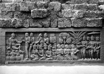 | Keywords: COLLECTIE TROPENMUSEUM Reliëf O 107 op de verborgen voet van de Borobudur TMnr 10015844.jpg nl Negatief Negatief waarop reliëf O 107 van de verborgen voet van de Borobudur te zien is De verborgen voet van de Borobudur is de oorspronkelijke basis van het Buddhistische heiligdom dat rond 800 gebouwd is In een latere fase van de bouw werd deze basis verborgen waarschijnlijk om verzakking te verkomen De verborgen voet loopt om het hele bouwwerk heen en bevat 160 reliëfs die tezamen de Mahakarmawibhangga verbeelden een Mahayanistische tekst die de werking van de leer van Karma uiteenzet Deze leerrede wordt aan Buddha toegeschreven en handelt over oorzaak en gevolg N J Krom en Th van Erp duiden in hun standaardwerk over de Borobudur Beschrijving van Barabudur Den Haag Martinus Nijhoff 1920-1931 de reliëfs van de verborgen voet aan als serie O Op de reliëfs zijn voorbeelden van de theorie uitgebeeld goede daden hebben goede gevolgen en slechte daden hebben slechte gevolgen De reliëfs vallen in twee delen uiteen O 1 tot en met O 117 verbeelden een aantal daden die leiden tot één en hetzelfde gevolg De reliëfs O 118 tot en met O 160 tonen verschillende gevolgen van één oorzaak De uiteenzetting van de leer begint bij de trap aan de oostzijde en ontrolt zich met de klok mee om het bouwwerk heen De reliëfs moeten dan ook gelezen worden van rechts naar links Lange tijd was onbekend wat op de reliëfs van de verborgen voet stond afgebeeld Hoewel de reliëfs al in 1885 waren ontdekt door Dr Ir J W IJzerman 1851-1932 kon de Franse geleerde Sylvain Lévi pas in 1929 op het zesde Congres van het Oostersch Genootschap constateren dat het op de verborgen voet ging om een Buddhistische tekst Mahakarmawibhangga Lévi had in 1922 een manuscript uit 1411 met deze tekst ontdekt in Kathmandu Nepal De tekst bleek populair in de Burdhistische wereld te zijn en een aantal verwante teksten te hebben twee Chinese werken waarvan één vertaald was in 582 door Gautama Dharmaprajna en één tussen 980 en 1000 door T'ien si Tsai Daarnaast bevat de Tibetaanse Kanjur twee werken met de titel Karmawibhangga In 1933 publiceerde de archeoloog N J Krom een uitgebreide analyse van het Mahakarmawibhangga op de reliëfs van de bedolven voet Hierin legt hij een relatie tussen de afbeeldingen op de reliëfs en de tekstpassages in het Mahakarmawibhangga De reliëfs O 101 tot en met O 108 bevinden zich aan de noordzijde van de Borobudur en hebben volgens N J Krom betrekking op de paragrafen twintig tot en met tweeëntwintig van het Mahakarmawibhangga XX Wat is de daad die een geboorte onder de goden van de sfeer der Begeerte ten gevolge heeft Antwoord de tien goede wegen van de daad goed ten einde gebracht Dat is de daad die een geboorte onder de goden van de sfeer der Begeerte ten gevolge heeft XXI Wat is de daad die een geboorte onder de goden van de sfeer van de Vorm ten gevolge heeft Antwoord de tien goede wegen van de daad goed ten einde gebracht goed eigen gemaakt en op de meest voortreffelijke wijze vervolmaakt Dat is de daad die een geboorte onder de goden van de sfeer van de Vorm ten gevolge heeft XXII Wat is de daad die een geboorte onder de goden van de Vormloze sfeer ten gevolge heeft Antwoord de vier instellingen der meditatie van het vormloze de categorie van de oneindigheid van de ruimte de categorie van de oneindigheid van de kennis de categorie van de oneindigheid van het niet de categorie van inzicht en niet-niet-inzicht; deze instellingen van meditatie worden toegepast en vermenigvuldigd Dat is de daad die een geboorte onder de goden van de Vormloze sfeer ten gevolge heeft Op O 101 en O 102 treffen wij hemelvoorstellingen aan Hemelvoorstellingen worden gekarakteriseerd door wensbomen potten vol kostbaarheden onderaan de stam en door twee kinnara's wezens die half mens half vogel zijn Ook op andere plaatsen op het monument worden deze symbolen gebruikt om de hemel voor te stellen Hemeltaferelen worden soms door de inscriptie 'swargga' aangeduid De staande figuren van O 101b en de zittende met aureool op O 102b bevinden zich in een hemel De oorzaak daarvan vinden we op O 101a de aanbieding van een gift aan een brahmaan Op O 102a zien we een predikende monnik en een uitdeling aan behoeftigen Op de linkertaferelen ontbreken de kinnara's en de hemelbomen maar het lijkt Krom niet onwaarschijnlijk dat hier ook een hemel bedoeld is we zien op O 103c naast een paleis of een tempel een persoon in groot ornaat tussen vrouwen die hem dienen De groep op O 104c is voorzien van aureolen O 104 a en op O 104b tonen een predikende monnik en een uitdeling Op 104a is een gift van geschenken afgebeeld aan brahmanen Op 104b zit een mediterende persoon tussen twee onafgewerkte bomen Volgens Krom is het aannemelijk dat de beeldhouwer de hemelboom met kinnara's gereserveerd heeft voor de Kamawacara-goden Hieruit volgt dat O 101 en O 102 bij paragraaf XX horen en de hemels van O 103 en O 104 bij de goden van Rupawacara van XXI De grote moeilijkheid komt dan bij de goden van Arupyawacara van XXII want het lijkt Krom uitgesloten dat deze wezens weergegeven kunnen worden in een vorm; men mag ze zelfs helemaal niet verwachten op reliëfs Maar Krom meent dat op O 105 een poging is gedaan om aan te geven om de staat van vormeloosheid te bereiken; de vier monniken die ieder in een afzonderlijke rotsnis zitten te mediteren zouden de vier samapatti's van de tekst vertegenwoordigen Op reliëf O 106 is de hoofdpersoon in groot ornaat afgebeeld met een aureool achter het hoofd Achter zijn dienaren staat op het midden van het reliëf een boom; niet de gestileerde hemelboom maar wel met de juwelenpotten aan de voet O 106a geeft een huldebetuiging weer onder andere met een tros bananen van een aantal monniken De hoofdpersoon van O 107b heeft geen aureool maar draagt wel groot ornaat Ook hier staan juwelenpotten O 107a toont een uitdeling van onder meer kleding Reliëf O 108 begint met het geven van geschenken door rijk geklede perso