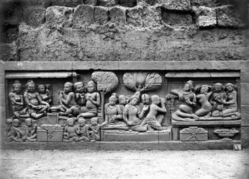 | Keywords: COLLECTIE TROPENMUSEUM Reliëf O 67 op de verborgen voet van de Borobudur TMnr 10015805.jpg nl Negatief Negatief waarop reliëf O 67 van de verborgen voet van de Borobudur te zien is De verborgen voet van de Borobudur is de oorspronkelijke basis van het Buddhistische heiligdom dat rond 800 gebouwd is In een latere fase van de bouw werd deze basis verborgen waarschijnlijk om verzakking te verkomen De verborgen voet loopt om het hele bouwwerk heen en bevat 160 reliëfs die tezamen de Mahakarmawibhangga verbeelden een Mahayanistische tekst die de werking van de leer van Karma uiteenzet Deze leerrede wordt aan Buddha toegeschreven en handelt over oorzaak en gevolg N J Krom en Th van Erp duiden in hun standaardwerk over de Borobudur Beschrijving van Barabudur Den Haag Martinus Nijhoff 1920-1931 de reliëfs van de verborgen voet aan als serie O Op de reliëfs zijn voorbeelden van de theorie uitgebeeld goede daden hebben goede gevolgen en slechte daden hebben slechte gevolgen De reliëfs vallen in twee delen uiteen O 1 tot en met O 117 verbeelden een aantal daden die leiden tot één en hetzelfde gevolg De reliëfs O 118 tot en met O 160 tonen verschillende gevolgen van één oorzaak De uiteenzetting van de leer begint bij de trap aan de oostzijde en ontrolt zich met de klok mee om het bouwwerk heen De reliëfs moeten dan ook gelezen worden van rechts naar links Lange tijd was onbekend wat op de reliëfs van de verborgen voet stond afgebeeld Hoewel de reliëfs al in 1885 waren ontdekt door Dr Ir J W IJzerman 1851-1932 kon de Franse geleerde Sylvain Lévi pas in 1929 op het zesde Congres van het Oostersch Genootschap constateren dat het op de verborgen voet ging om een Buddhistische tekst Mahakarmawibhangga Lévi had in 1922 een manuscript uit 1411 met deze tekst ontdekt in Kathmandu Nepal De tekst bleek populair in de Burdhistische wereld te zijn en een aantal verwante teksten te hebben twee Chinese werken waarvan één vertaald was in 582 door Gautama Dharmaprajna en één tussen 980 en 1000 door T'ien si Tsai Daarnaast bevat de Tibetaanse Kanjur twee werken met de titel Karmawibhangga In 1933 publiceerde de archeoloog N J Krom een uitgebreide analyse van het Mahakarmawibhangga op de reliëfs van de bedolven voet Hierin legt hij een relatie tussen de afbeeldingen op de reliëfs en de tekstpassages in het Mahakarmawibhangga Reliëf O 67 bevindt zich aan de westzijde van de Borobudur en correspondeert volgens N J Krom met de twaalfde paragraaf van het Mahakarmawibhangga Wat is de daad die een groot bezit ten gevolge heeft Antwoord het afzien van het nemen van wat niet gegeven is; het anderen afhouden van het nemen van wat niet gegeven is; het zich erover verheugen wanneer anderen ervan afzien te nemen wat niet gegeven is; het schenken van levensonderhoud aan vader en moeder; het schenken van levensonderhoud aan edele deugdzame lieden; desgelijks het schenken van levensonderhoud aan anderen zieken kinderen grijsaards en ellendigen; tevredenheid met het voordeel van een ander; ontevredenheid wanneer een ander geen voordeel heeft; het zich zeer verheugen in andermans voordeel; het genoegen scheppen in een goede oogst Zo ook Dat is de daad die een groot bezit ten gevolge heeft Uit N J Krom Het Karmawibhangga op Barabudur Mededeelingen der koninklijke academie van wetenschappen afdeeling letterkunde deel 76 serie B No 8 Amsterdam Noordhollandsche Uitgevers-Maatschappij 1933 231 Deze passage heeft betrekking op de reliëfs O 66 tot en met O 73 Deze reliëfs tonen een aantal personen die getuige zijn van een uitdeling Pp het linkertafereel zijn rijke personen afgebeeld; er staan opgestapelde schatten afgebeeld en de personen bevinden zich in een aanzienlijke omgeving Op deze reliëfs is de goede oogst uit de tekst achterwege gelaten Op reliëf O 67a zijn een aantal personen in gesprek in een paviljoen Krom merkt op dat het zonder de tekst niet mogelijk zou zijn hieruit af te leiden dat deze personen ervan afzien om te nemen wat niet gegeven is en dat zij zich hierover verheugen Bronnen A J Bernet Kempers Borobudur Mysteriegebeuren in steen Verval en restauratie Oudjavaans volksleven Wassenaar 1973/gewijzigde herdruk ; Van Erp Th Krom N J Beschrijving van Barabudur Den Haag Martinus Nijhoff 1920-1931 ; N J Krom Het Karmawibhangga op Barabudur Mededeelingen der koninklijke academie van wetenschappen afdeeling letterkunde deel 76 serie B No 8 Amsterdam Noordhollandsche Uitgevers-Maatschappij 1933 Reliëf O 67 op de verborgen voet van de Borobudur 1890-1891 institution Tropenmuseum KIT-source 10015805 Creator Kassian Cephas Borobudur in 1890 Black and white photographs |
